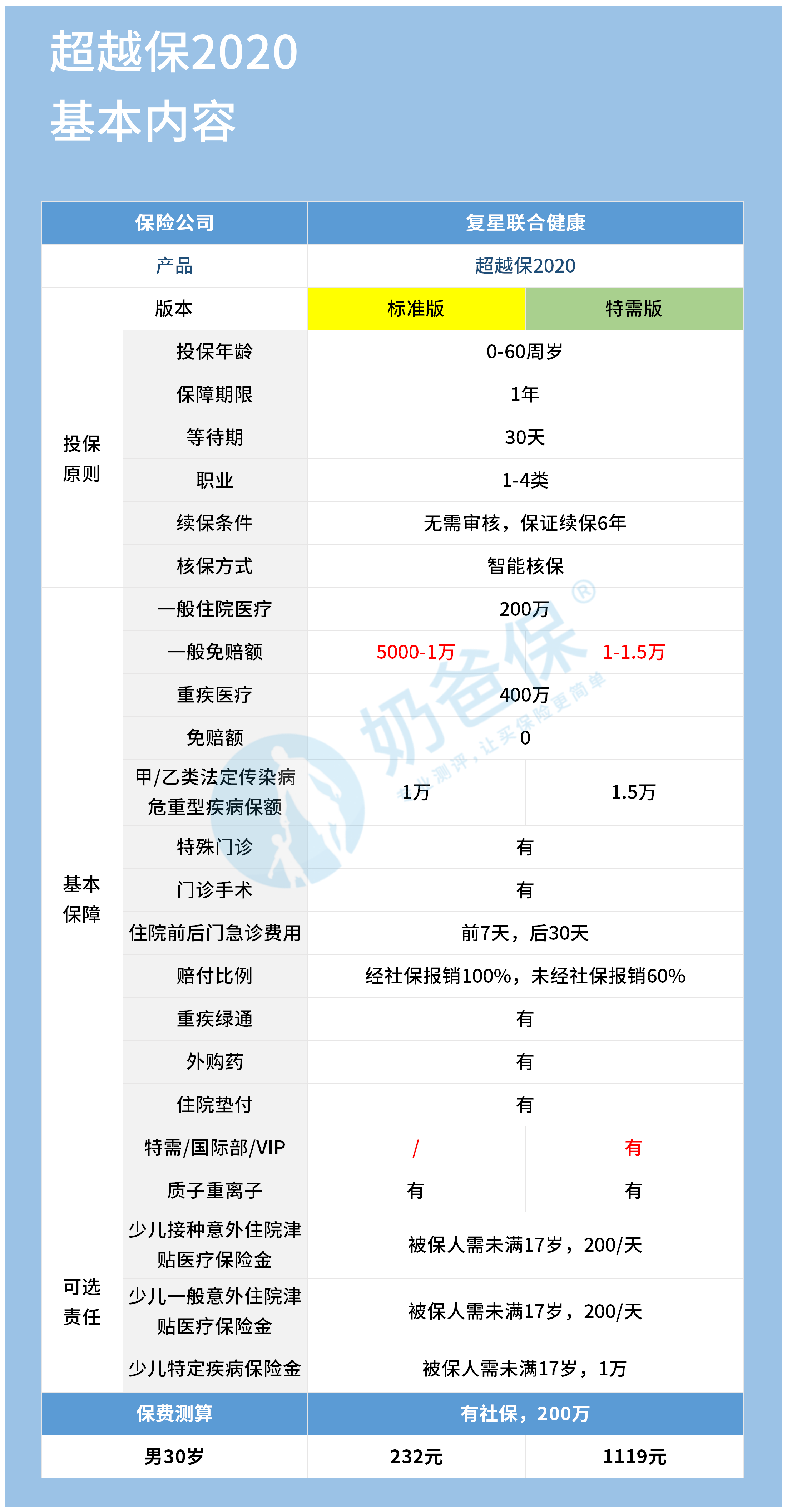 如果大家追求更加优质医疗体验,可以考虑选择超越保2020特需版的,虽然这个版本会比标准版多花几百元,但是可以换来优质的特需医疗体验,还是比较不错的!