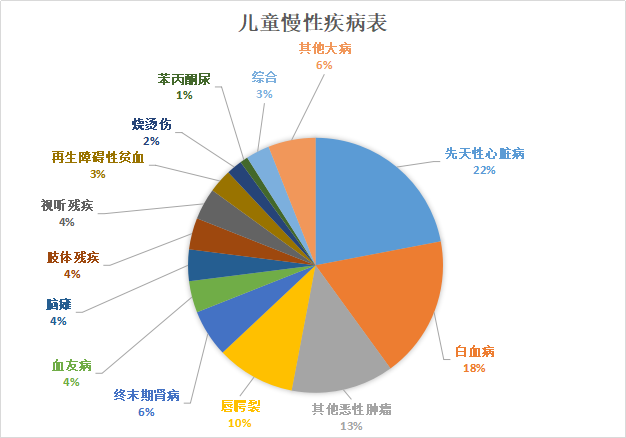 根据儿童慢性疾病表可以看出,除了先天性心脏病以外,儿童会出现多种重大疾病,其中白血病和其他恶性肿瘤的占比最高,也就是说,即使是儿童也会有患癌症的风险。