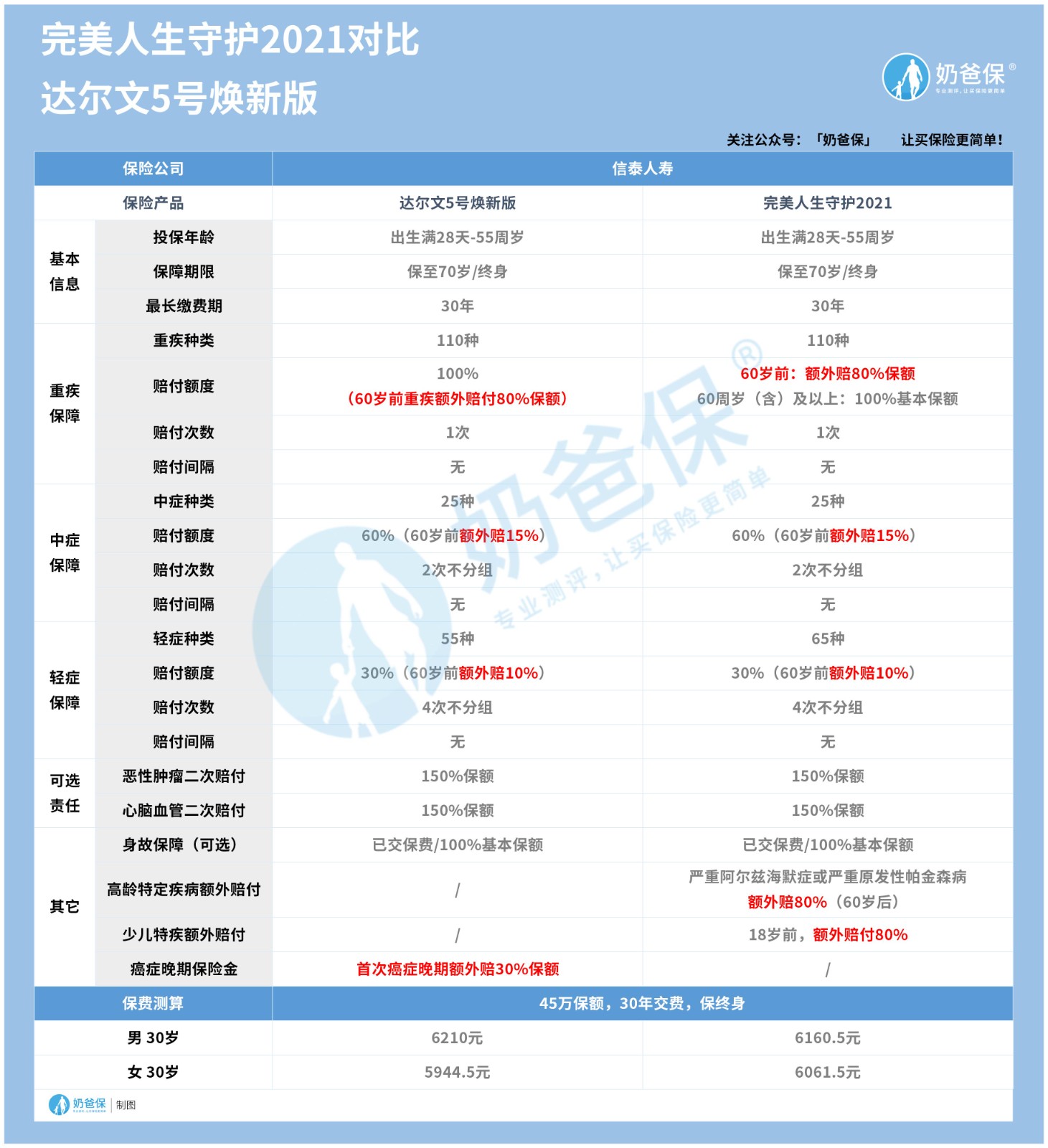 单独分析完信泰达尔文5号焕新版的内容,接着奶爸拿同公司的完美人生守护2021作对比,看看对比结果怎么样。