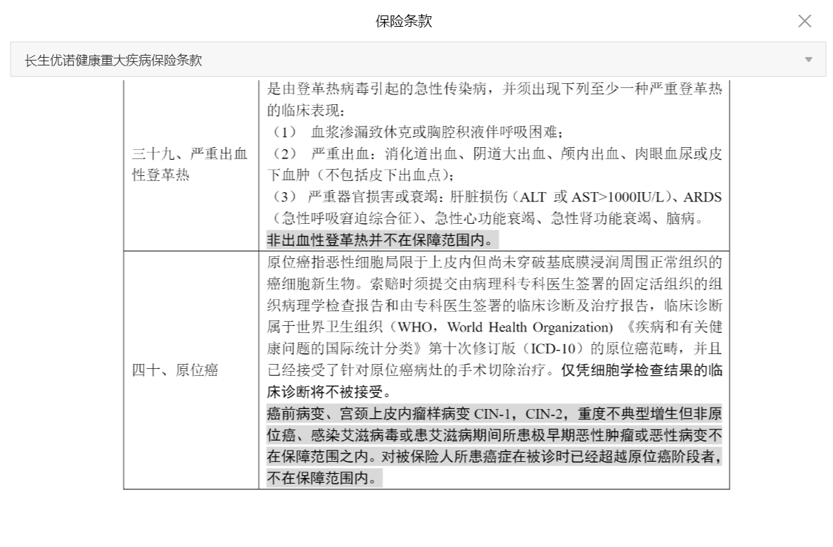 长生优诺健康重疾险提供40种轻症保障,我们可以看出它是保原位癌的,约定的轻症名单中第四十个正是原位癌。