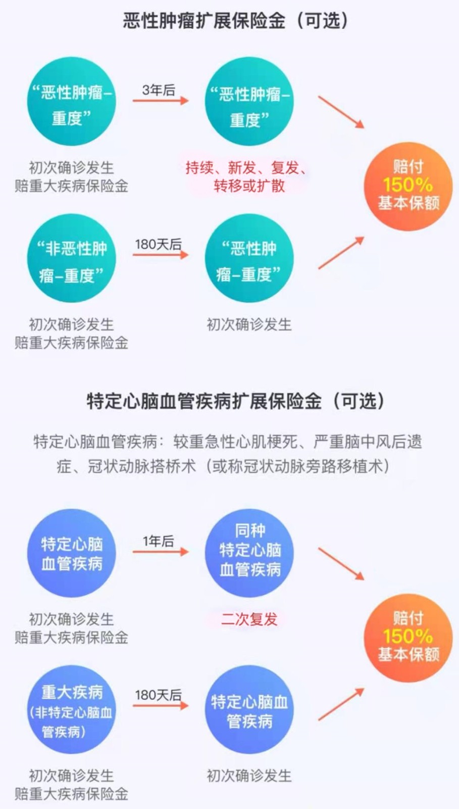 达尔文5号焕新版重疾险有两个不错的可选责任。有恶性肿瘤-重度二次赔偿和特定的心脑血管疾病的二次赔偿。