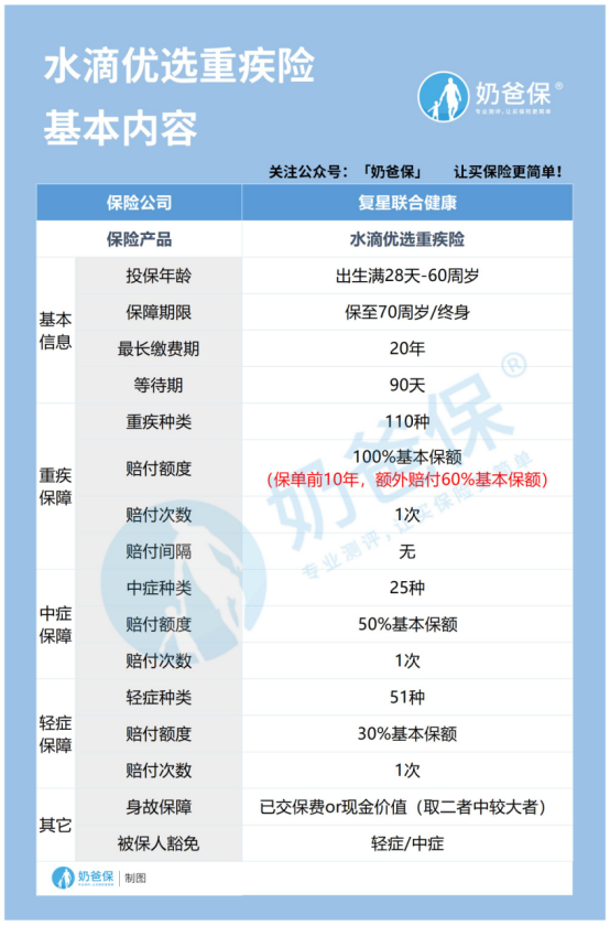 水滴优选重疾险保障110种重疾,并且约定在保单前10年,如果被保人不幸确诊重疾,符合合同约定,将获得60%基本保额额外赔付,也就是一共赔付160%基本保额。
