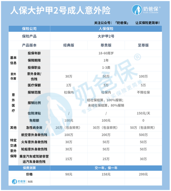 人保这款大护甲2号,有三个保障版本:经典版、尊贵版和至尊版,分别对应的意外身故/伤残保额为30万、50万和100万。