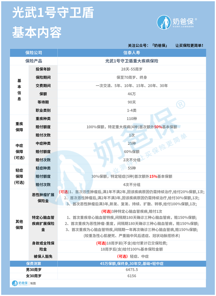 现在奶爸给大家重点分析一下光武1号守卫盾重疾险的保障内容: