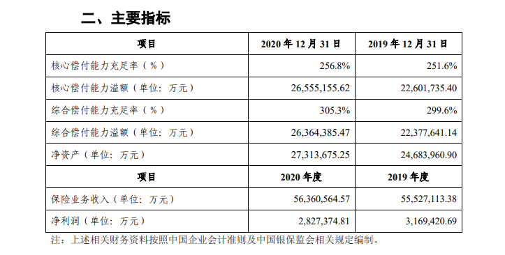 2020年末,核心偿付能力充足率高达256.8%、综合偿付能力充足率也高达305.3%,远远超过了银保监会的要求。