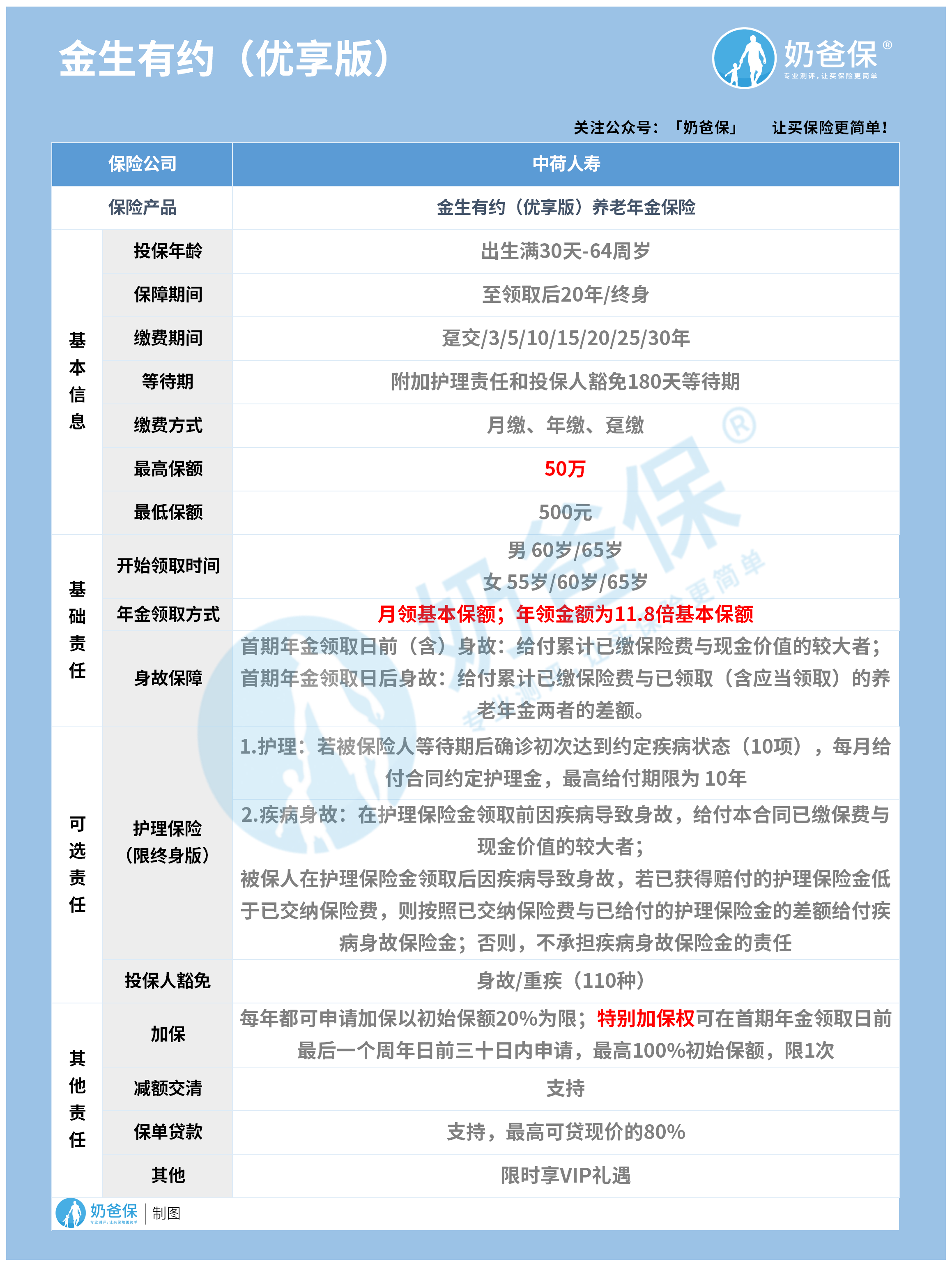 奶爸已将这款金生有约(优享版)养老年金险的产品内容进行了整理(如下图)。