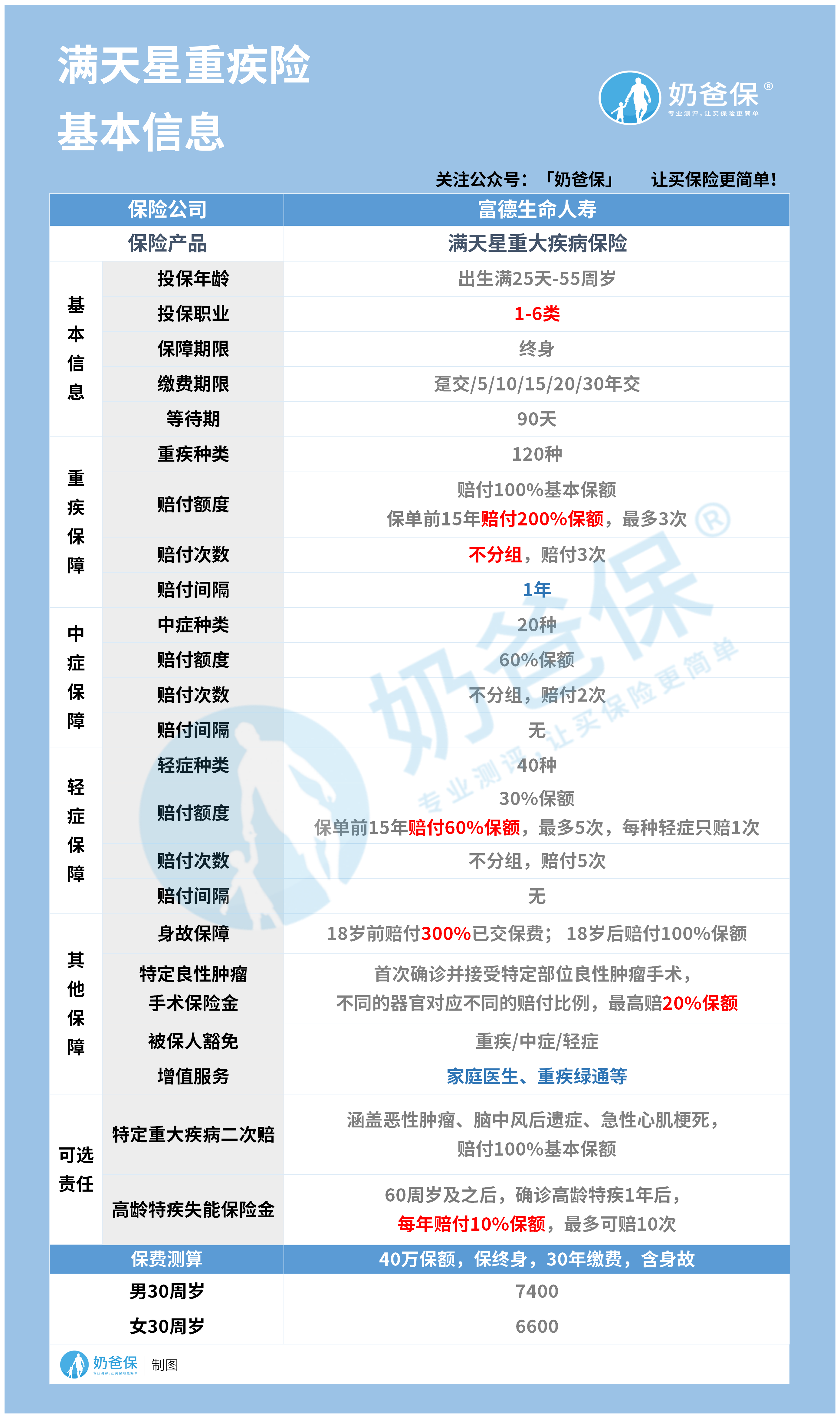 由于这篇文章是分析富德生命满天星重疾险的优缺点,所以奶爸就不在这里对其保障内容展开分析,感兴趣的朋友不妨戳这里了解:《富德满天星重疾险测评!》。