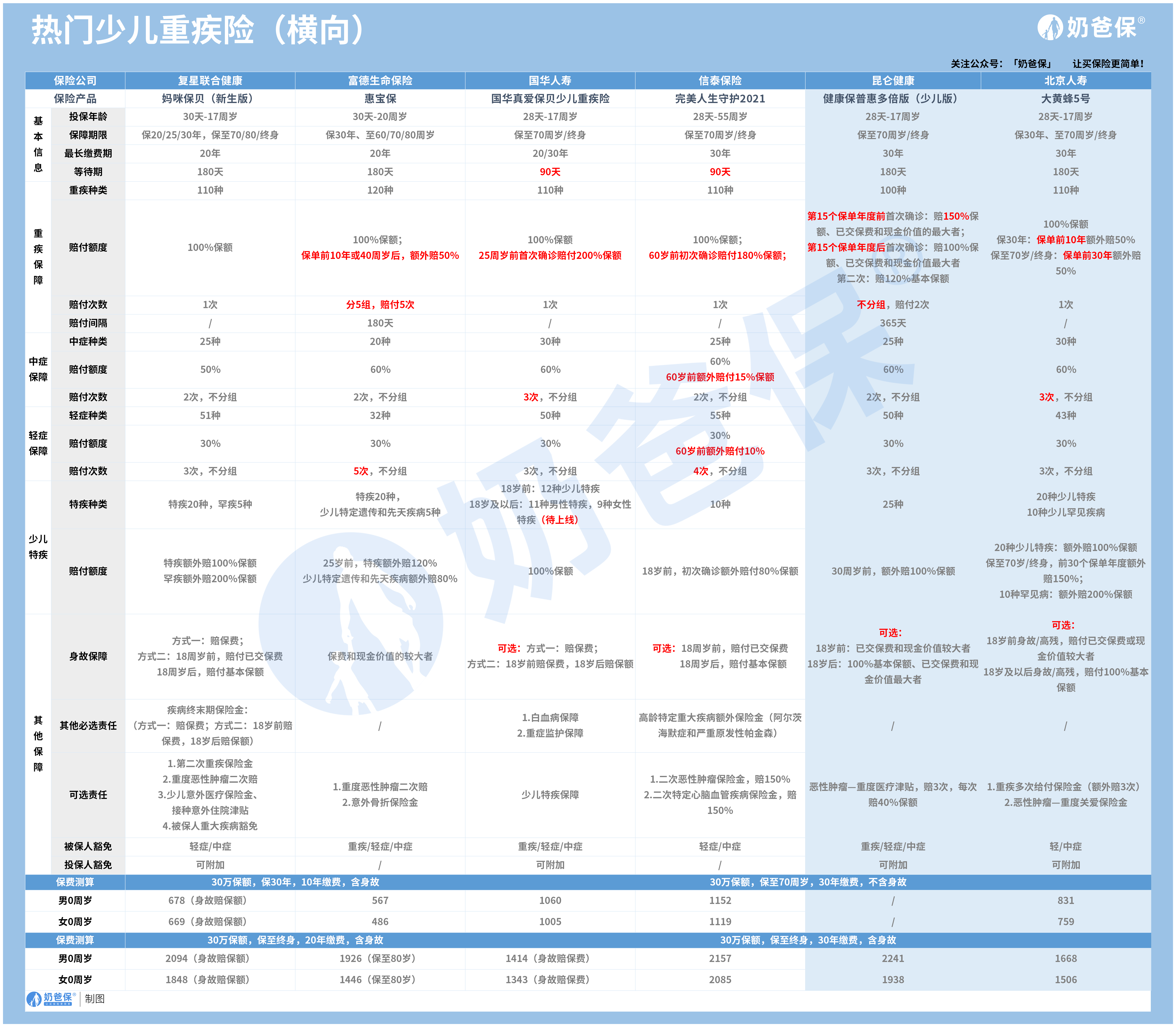 健康保普惠多倍版则对25种少儿特疾30岁前额外赔付150%基本保额,没有少儿罕见疾病保障,虽然范围及力度不及大黄蜂重疾险的好,但也是比较不错的。