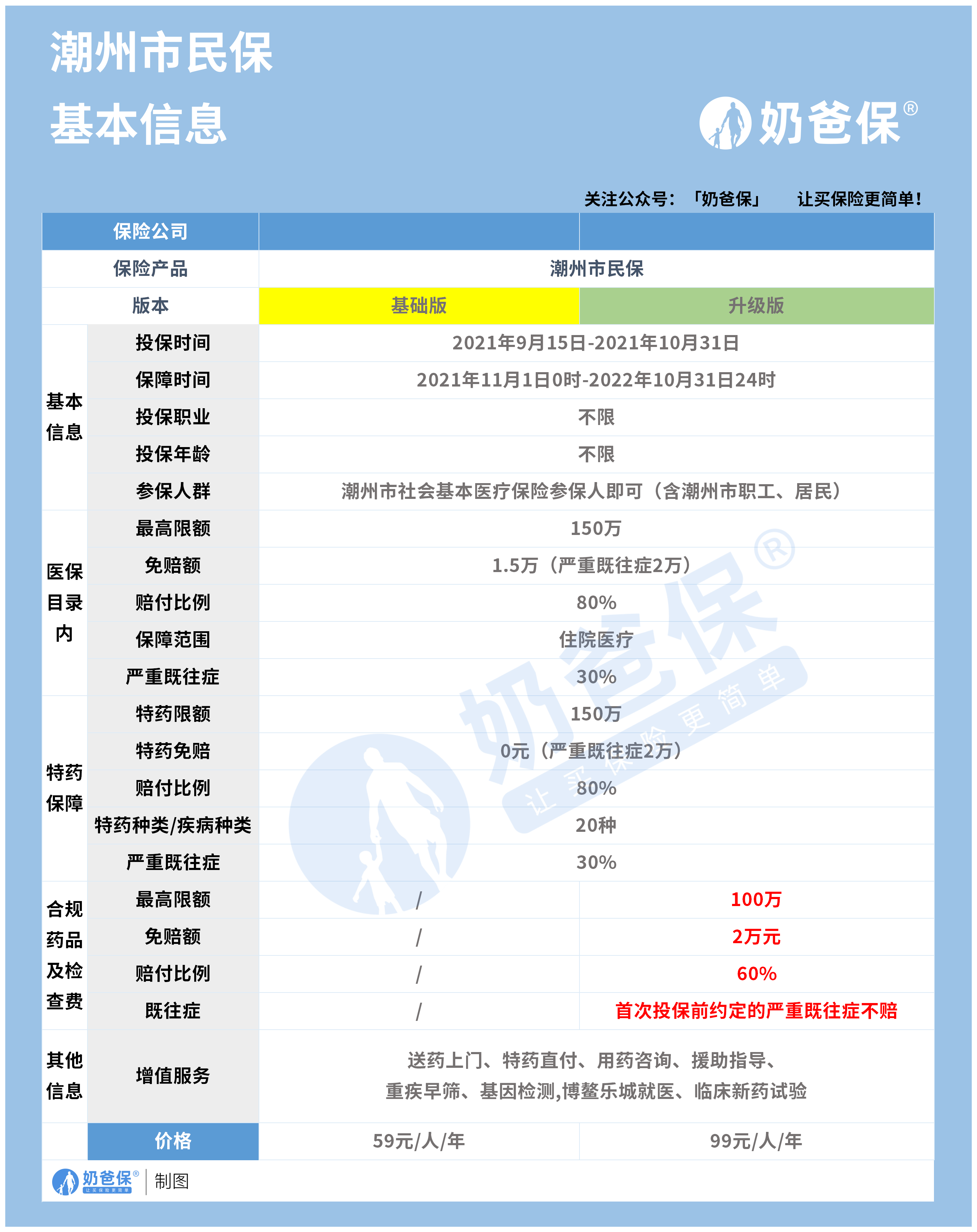 潮州市民保2021版分为基础版和升级版,两个版本在保障上会有差异,保费也不同。