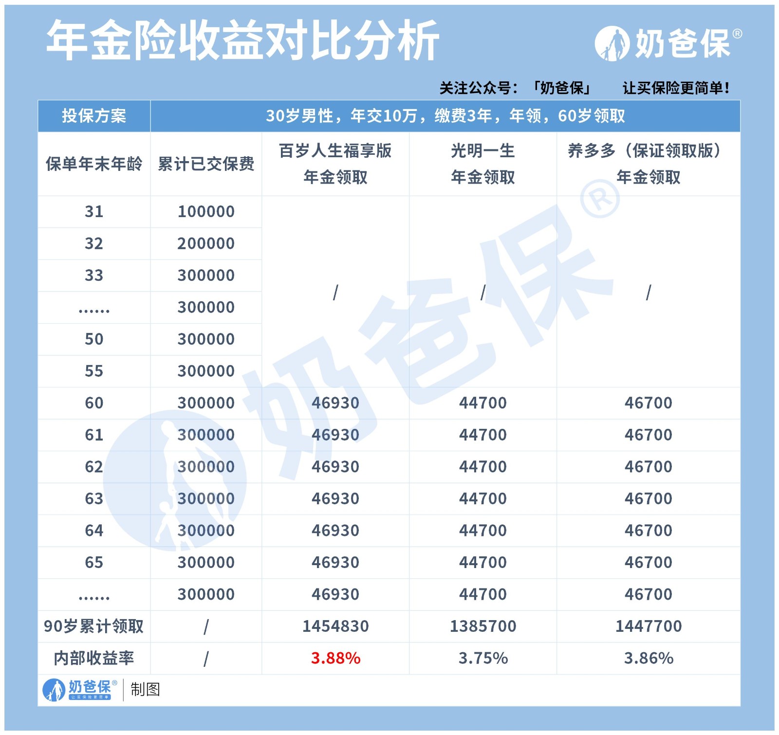 奶爸选了光明一生和养多多做对比,同样是30岁男性,3年缴费,年交10年,60岁领取,