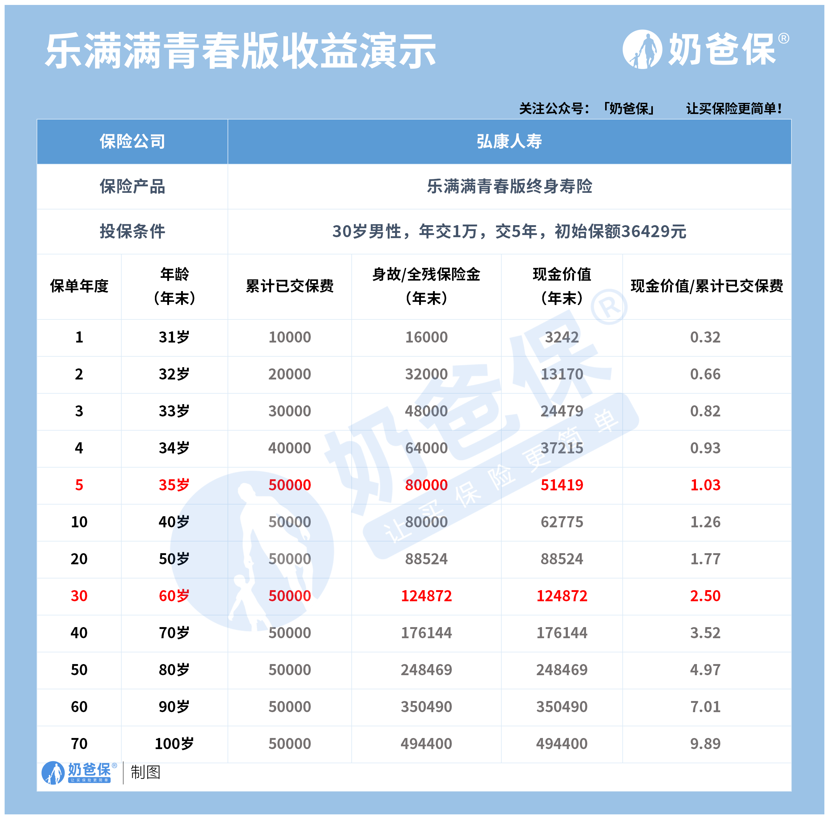 奶爸以“30周岁男性+年交1万+交5年”为测算条件,测算数据如下: