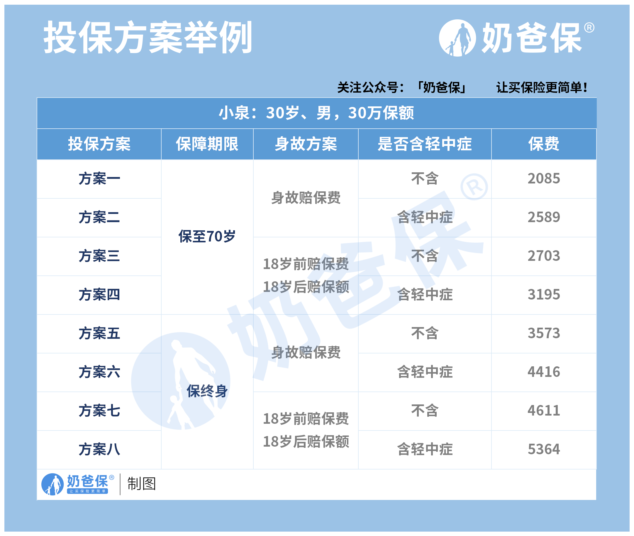 小泉若预算有限,最低可以选择保障方案一:保至70周岁+重疾+身故保障(赔保费)。