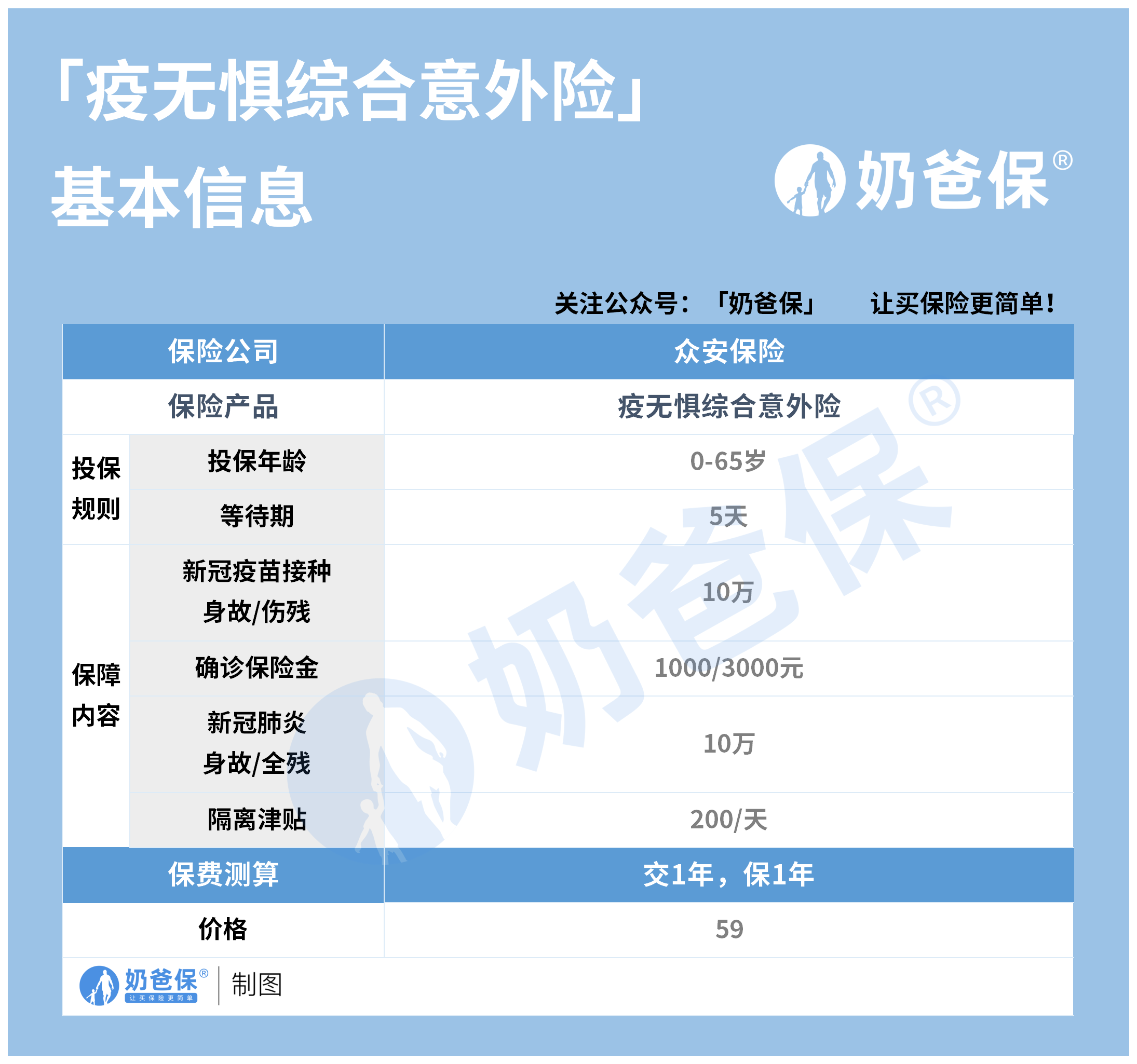 众安保险疫无惧综合意外险是交一年保一年的,它的定价为59元/年。