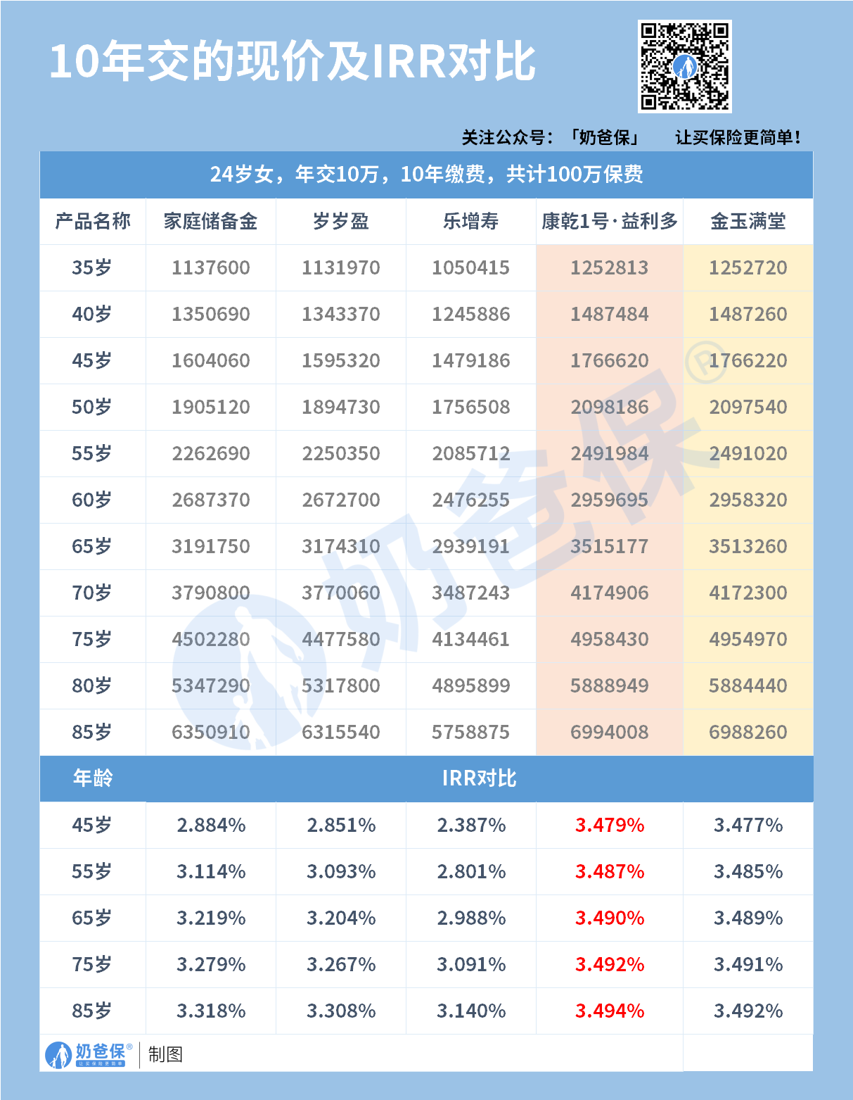 可以看到在24岁女,年交10万,10年缴费,共计100万保额的投保方案下,