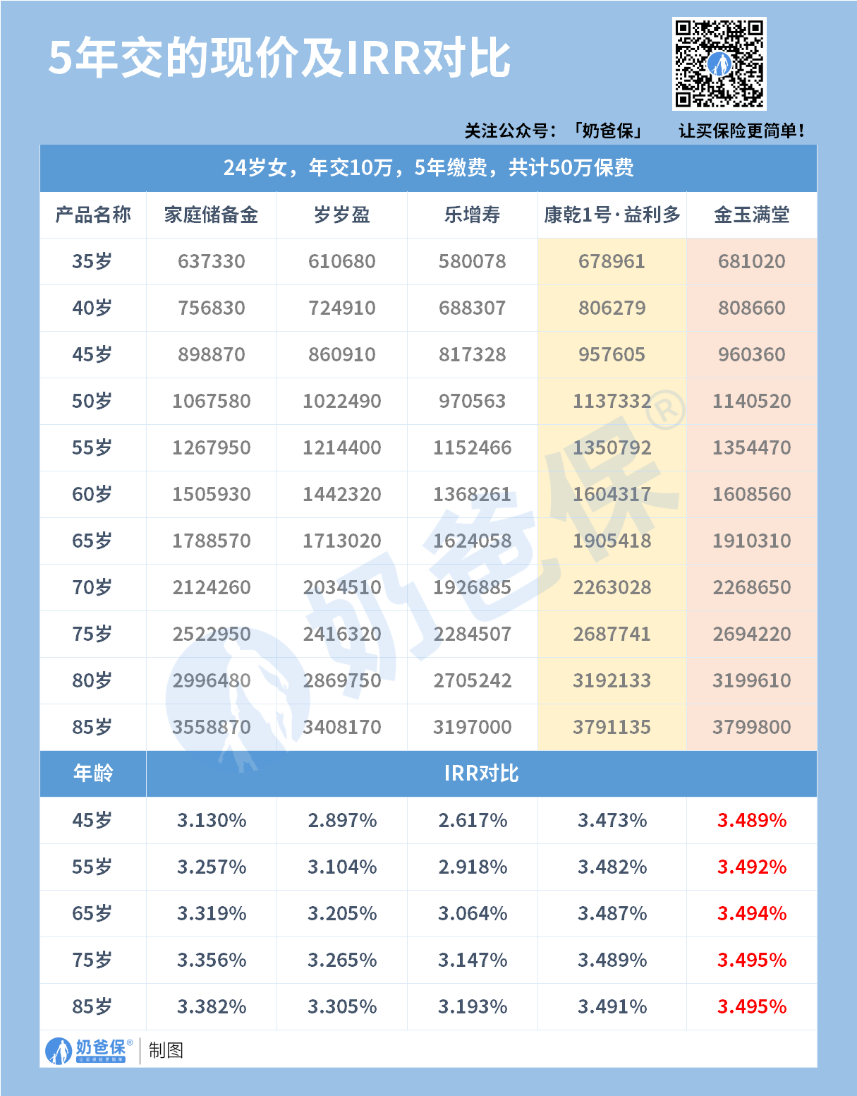 封闭期超短:30岁男性,年交10万,趸交、3年交只要3年,5年交也仅需5年即可;30岁男性年交10万交,交3年,80岁时IRR达3.36%