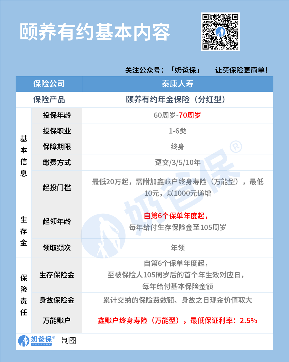 泰康颐养有约养老年金自带万能账户,最低保底利率在2.5%。