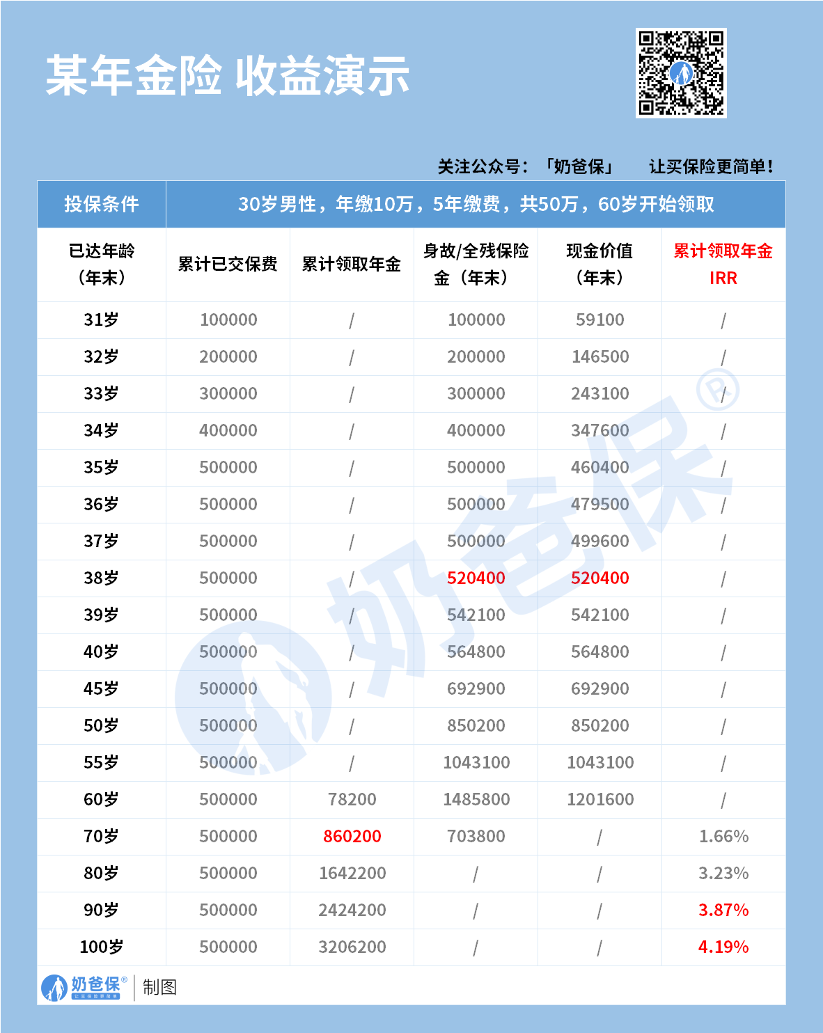 到80岁时,累计领取金额是已交保费的3.28倍,此时IRR为3.23%。