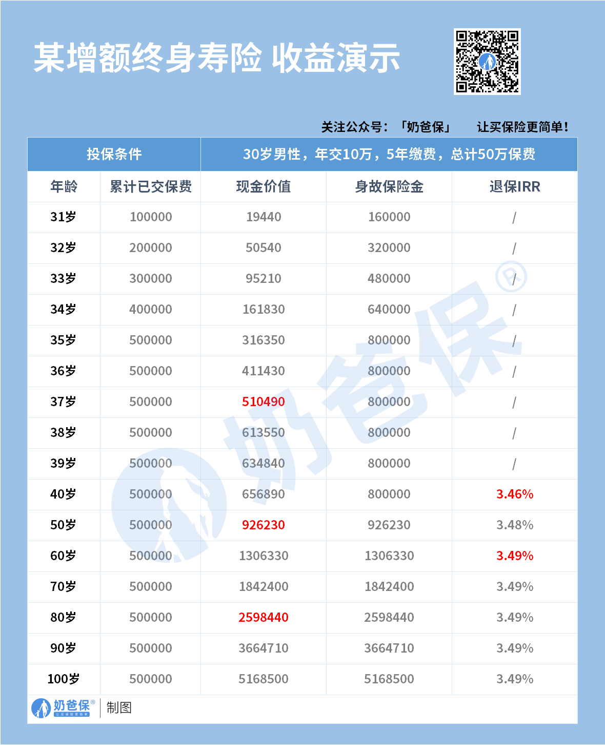 我们再以30岁的王先生,年交10万,交5年,共计50万保费为例,