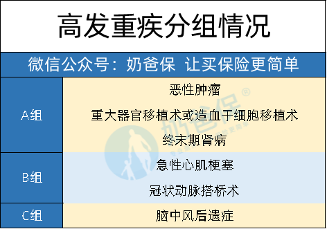恶性肿瘤与其他两种高发重疾分在同一组,大大降低了其他两种重疾的赔付概率。