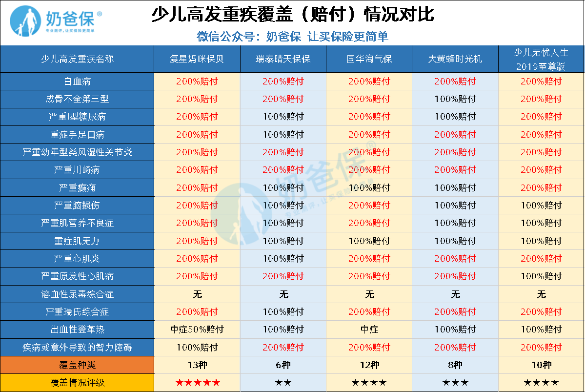 奶爸通过对比热门少儿重疾险,看看少儿无忧人生2019至尊版覆盖如何: