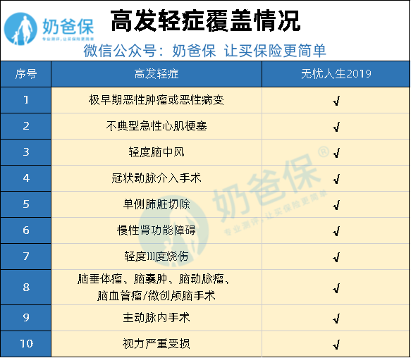 人保无忧人生2019重大疾病保险的轻症涵盖50种,其中高发轻症覆盖有10种,这是一个比较高的数字,且高发轻症占了轻症理赔事件的90%以上。所有,这点是值得考虑的。