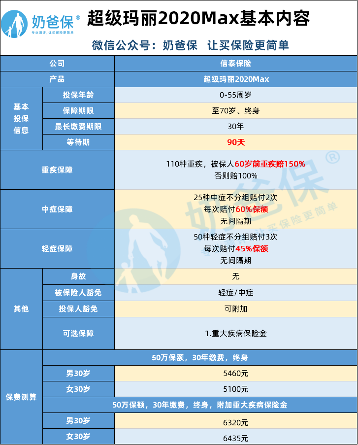 综合来看,超级玛丽2020Max是一款保障全面的消费型重疾险,重症最多赔付150%保额、中症轻症的保障也没有落下,还可选特定重疾二次赔付。