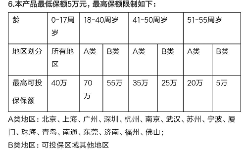 保额的下限为5万元,上限是根据被保人所在地区而定的: