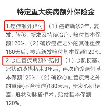 3、可选癌症、心血管二次赔付,其中癌症二次可以赔付120%保额。