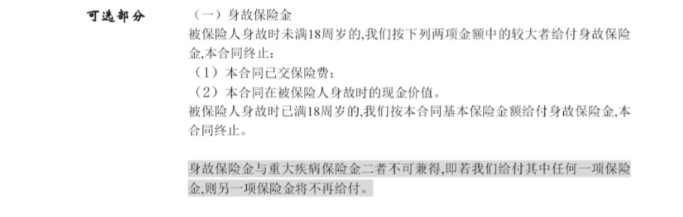 条款有提到,身故保险金和重大疾病保险金只能赔付其中一项,不能两项都赔付。