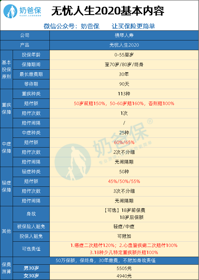 4)可选责任是无忧人生2020的一大亮点,癌症二次赔付120%保额,心血管疾病二次赔付100%保额。