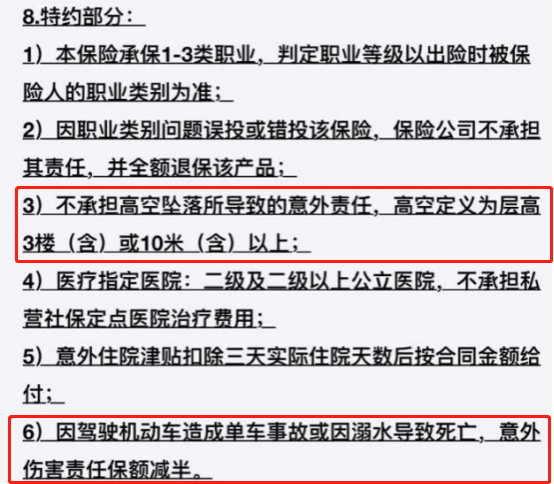 这是之前在支付宝销售的比较好的一款意外险,是不承担高空坠物导致的意外责任;驾车及溺水保额还减半等等。