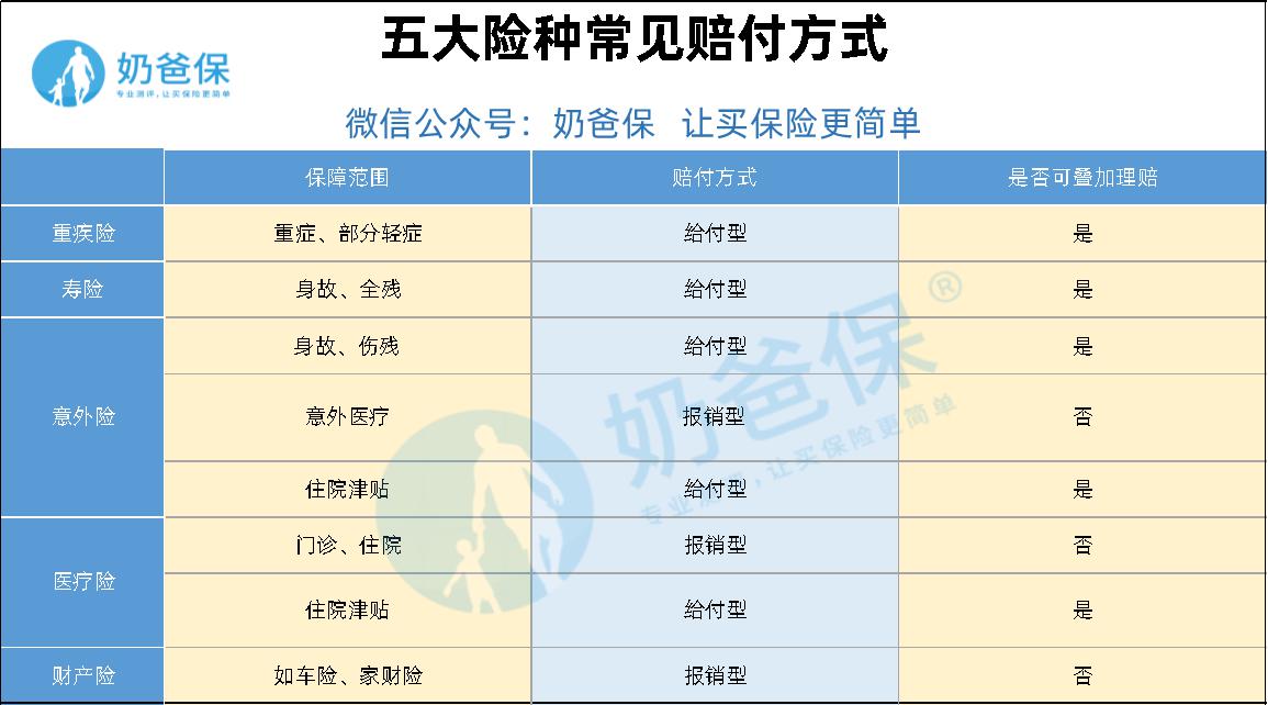 至于报销型的医疗险、财产险,买多了那是白花冤枉钱。如果不记得太多细节,看下面的表格就一目了然了。