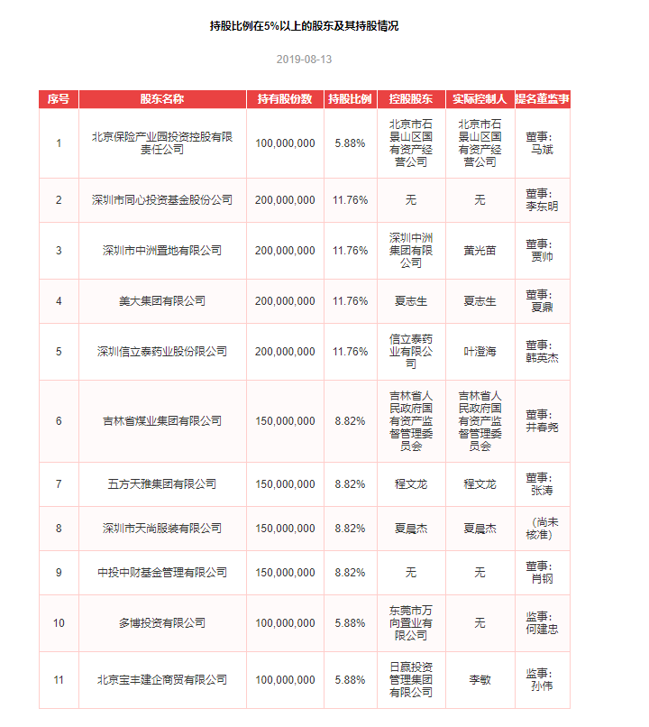 下面是爱心人寿保险公司于2019年8月份公布的,爱心人寿保险公司持股在5%以上的股东及其持股情况: