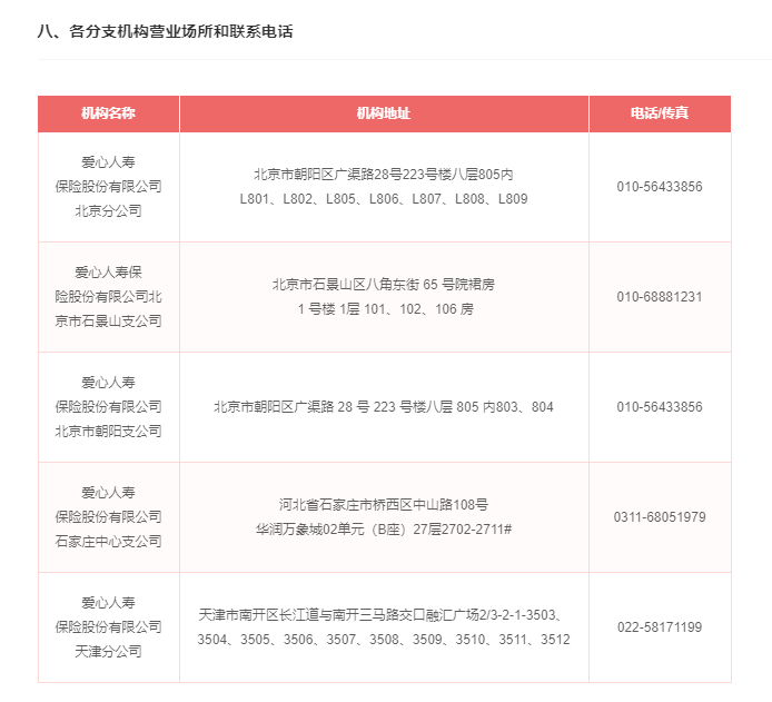 爱心人寿分支机构地址及联系电话详细信息如下: