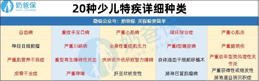 昆仑守卫者3号自带少儿特疾保障,针对20种少儿特疾,被保人一旦18岁前出险,即可获得150%的保额赔付,最多赔付一次,具体保障的20种少儿特疾如下: