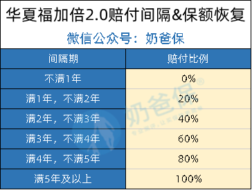 华夏福加倍2.0重疾无限次赔付:首次赔付保额,第二次按间隔期长短进行赔付,间隔期1年、2年、3年、4年、5年分别对应赔付保额的20%、40%、60%、80%、100%;最高100%。