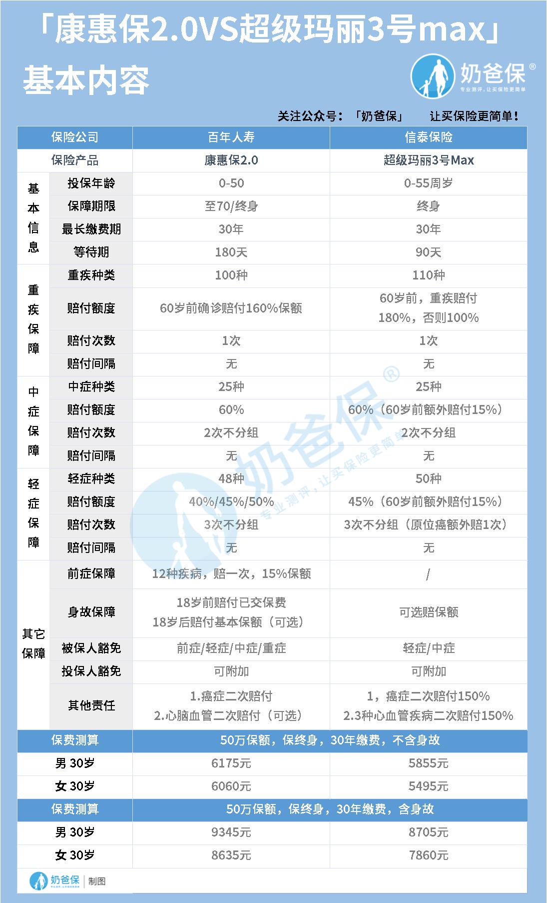 最近众多热门重疾险产品纷纷调整、停录,由百年人寿承保的康惠保2.0还保持原有的产品形态,很多关注的朋友都来问奶爸这款康惠保2.0和超级玛丽3号max相比哪款更好?