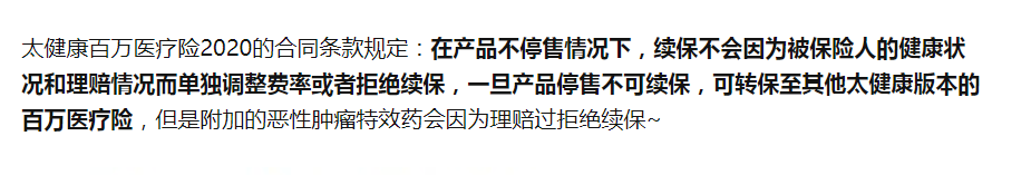 总的来说,虽然太健康百万医疗险2020续保条件好,对于肿瘤保障比较突出,但是在价格上没有很大的优势,性价比一般,对重疾住院津贴有所缺失。