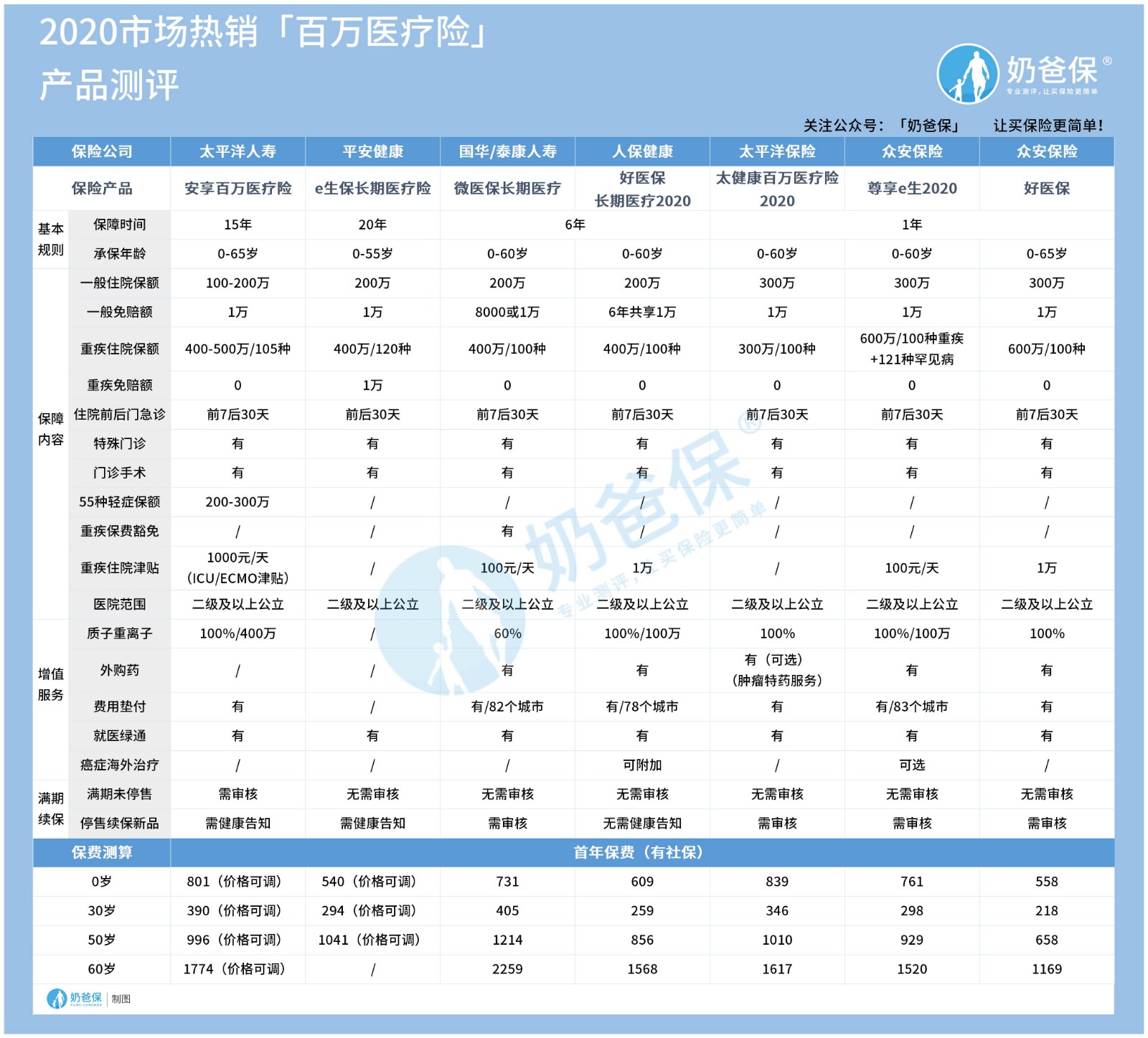 奶爸整理了2020年市场热销的百万医疗险,如下图: