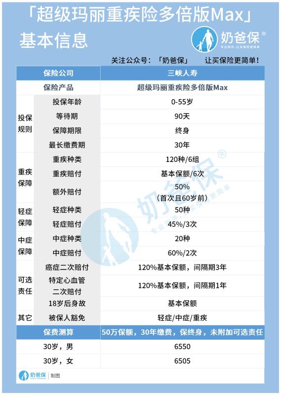 超级玛丽重疾险多倍版Max是三峡人寿推出的一款分组多次赔付终身重疾险产品,很多人可能会觉得这个名字很熟悉,因为之前信泰超级玛丽3号Max重疾险奶爸经常提起。