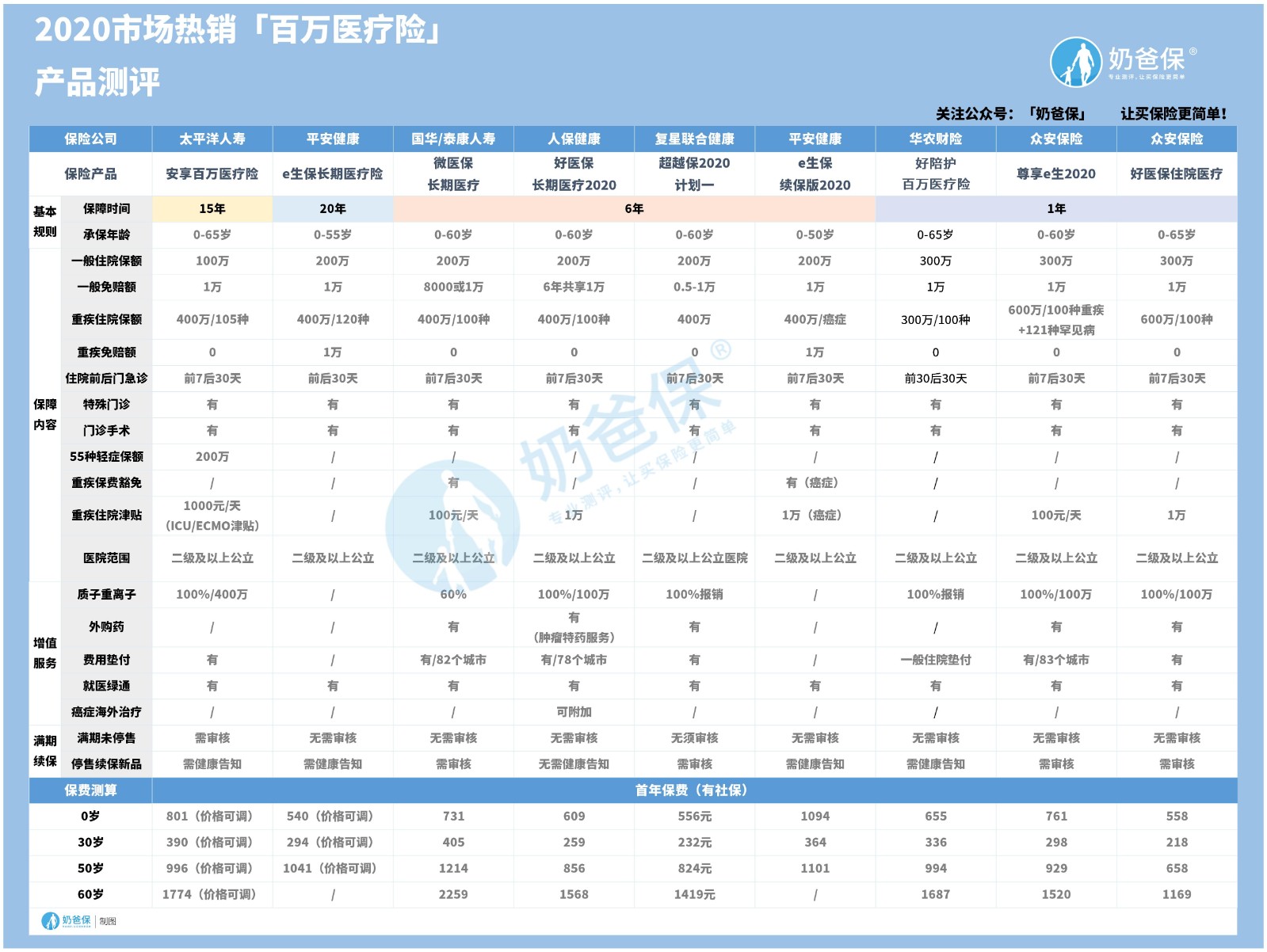 为了给出更客观的答案,奶爸选取了市面上热门的不同保障期限的百万医疗险做简单对比测评: