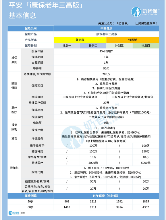 这款产品一共有两个版本,分别为普惠版和特需版,而每个版本又有两个不同计划,所以为了方便大家更好的了解平安i康保老年医疗险三高版,奶爸将它的主要信息整理之后,放进了表格中。