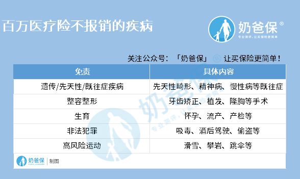上面讲了百万医疗险不赔的疾病,下面奶爸来讲一讲百万医疗险免责条款里的内容,即一些不赔的情况。