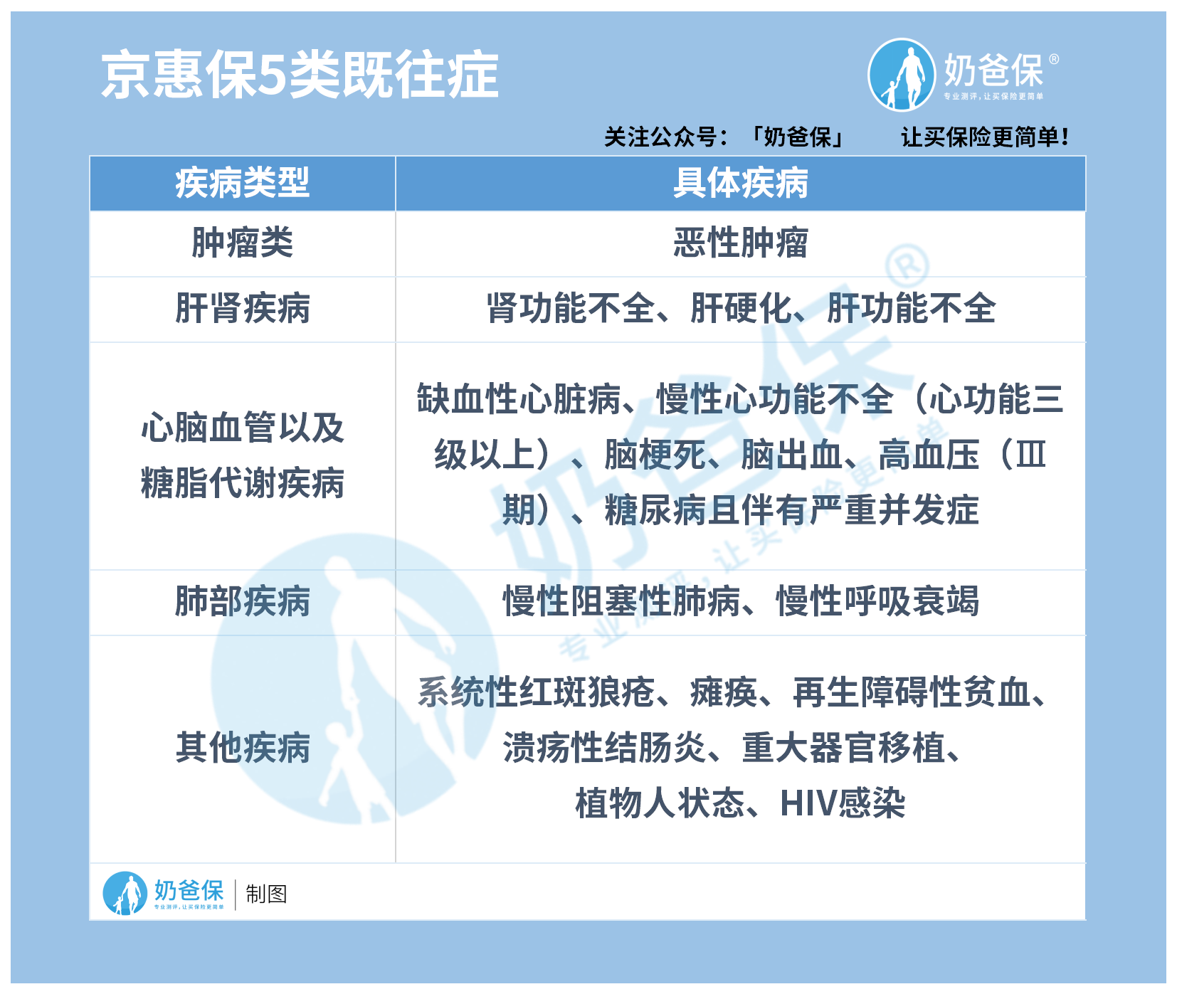 北京京惠保虽然不限制健康状况投保,但是对被保人有以下5类既往症的限制:
