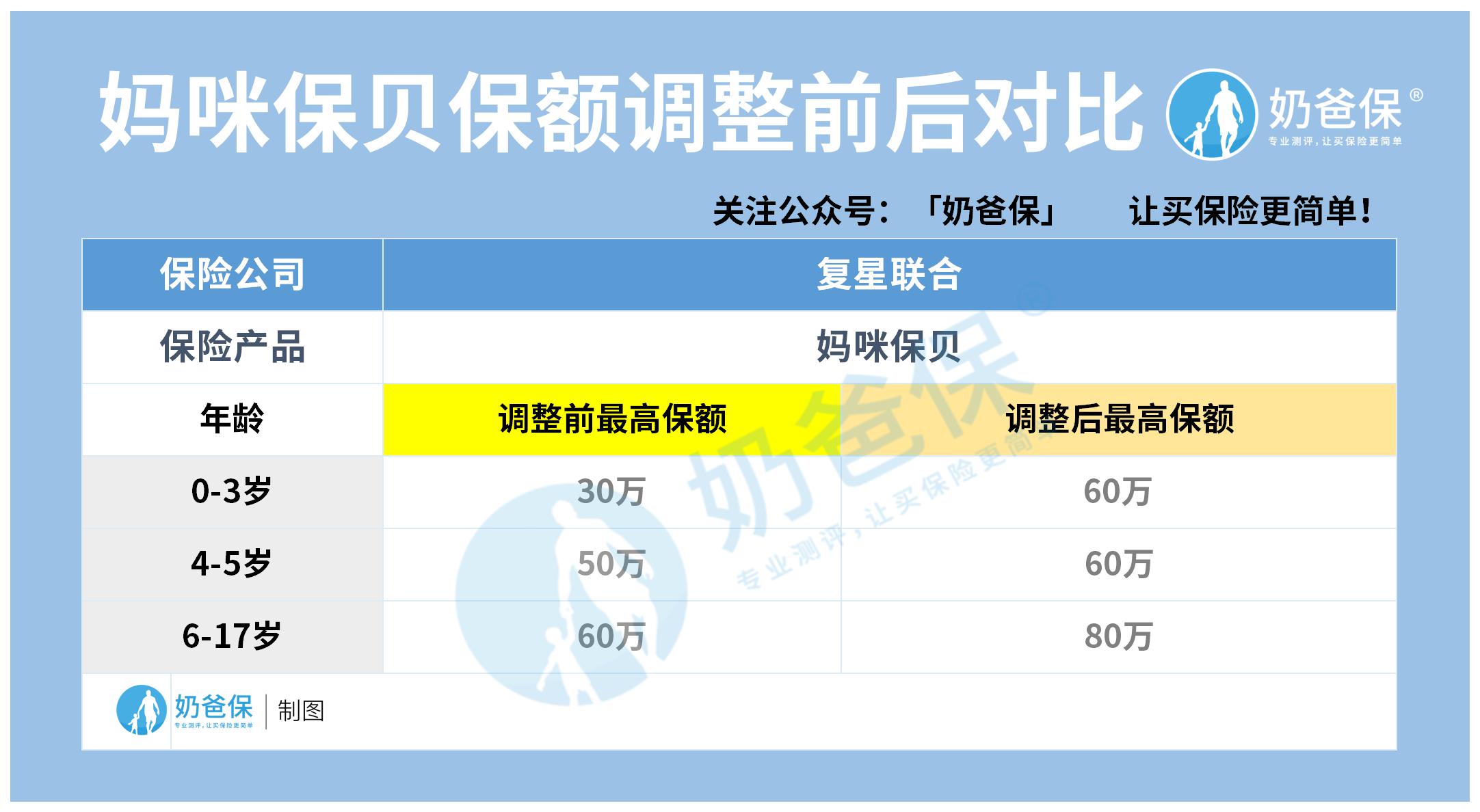 从表格中我们看到调整后,妈咪保贝的最高保额从一开始的60万提高到了80万,整整多了20万保额,相当于加多了一份保额20万的重疾险。
