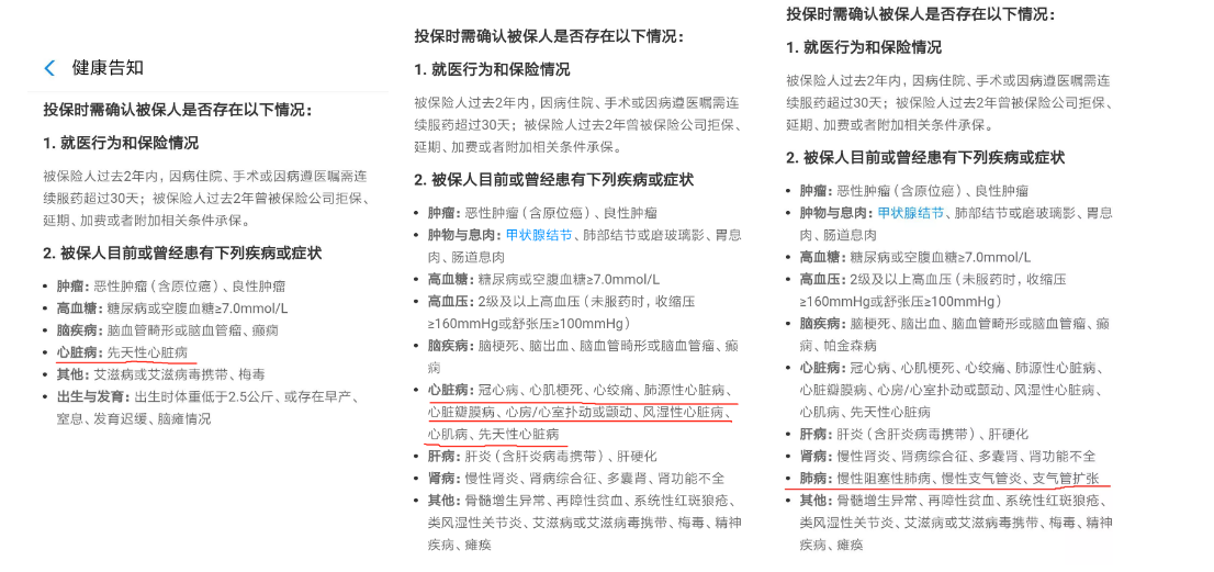 如图显示,从0岁,30岁,60岁人群的健康告知,年龄越大健康告知越多。比如0岁只会询问是否有先天性心脏病;而成年人会询问跟心脏病相关的疾病;老年人还会问询是否有相关的肺部疾病。