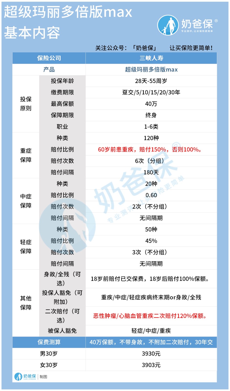三峡超级玛丽多倍版max原名三峡福倍倍保,是三峡人寿推出的一款重疾险产品,它约定60岁前额外赔付,特定疾病二次赔付,在重疾险市场中引起了一定的反响。