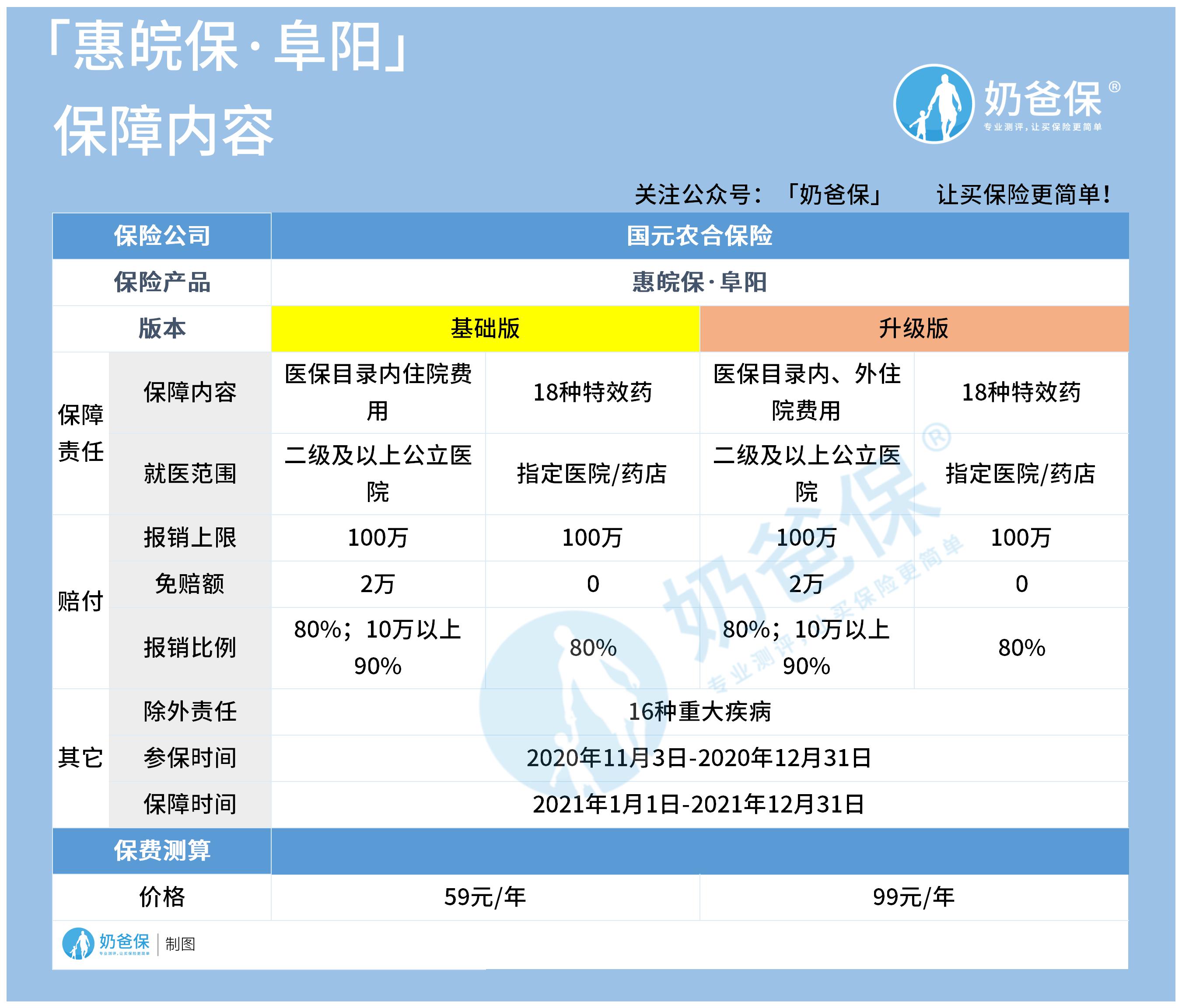 奶爸已经将惠皖保阜阳保基础版和升级版的内容做了整理,已经放在一张表格中,我们一起看看: