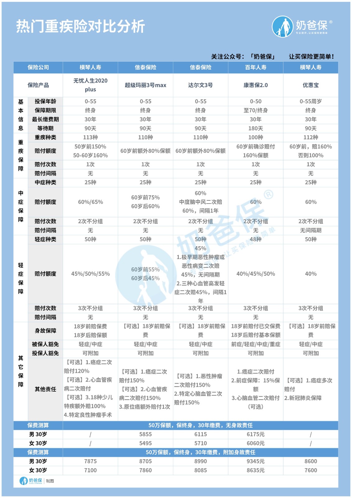 上面奶爸大致给大家介绍了消费型重疾险和返还型重疾险各自是什么和它们二者的区别,为了让大家能直观感受消费型重疾险的保障内容和特点,奶爸做了一张消费型重疾险保障对比表,我们一起来看一看。