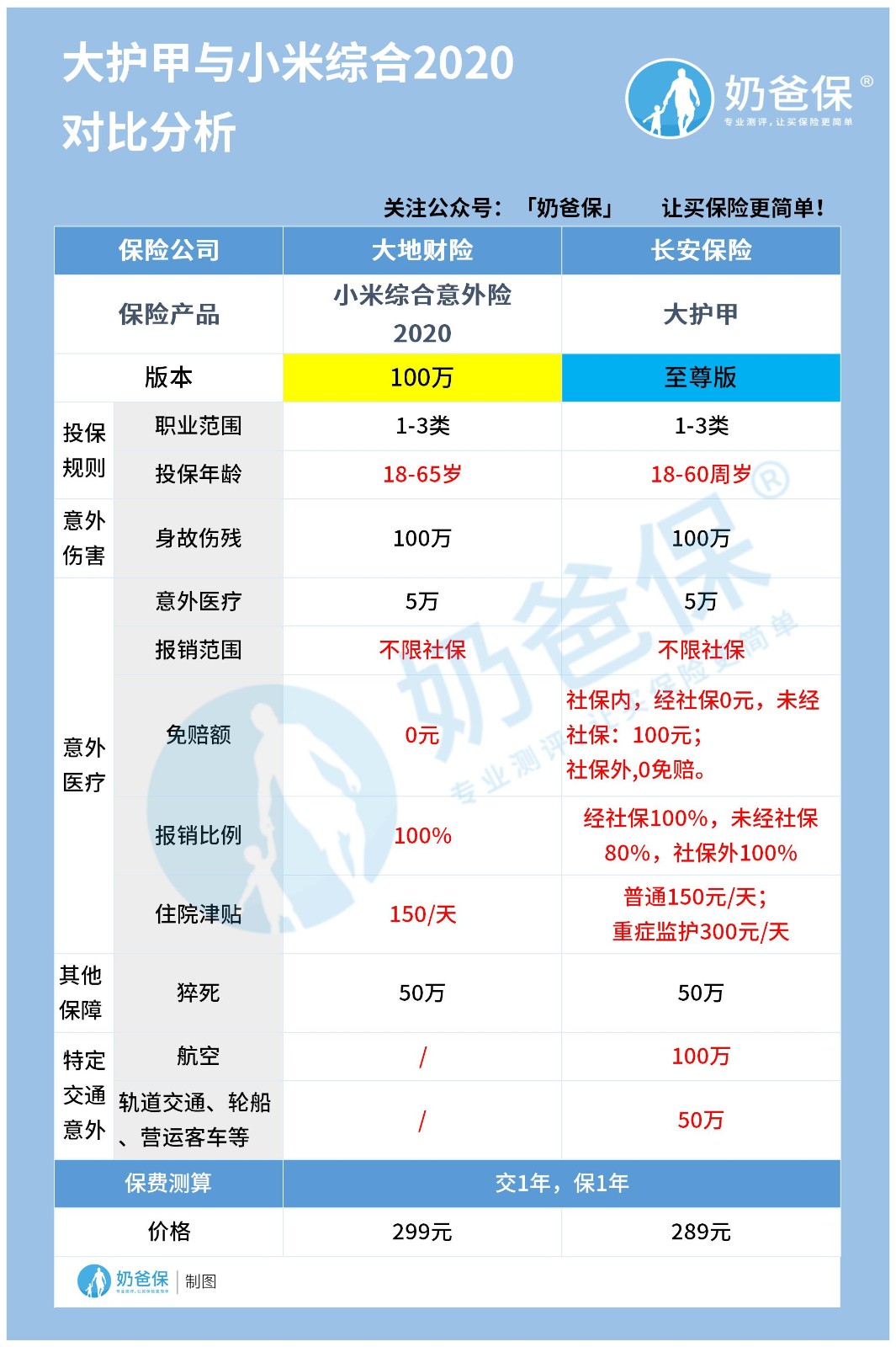 报销比例:小米综合意外险2020一百万版不限社保,社保内外统统100%报销,而大护甲至尊版社保内经社保报销100%,未经社保报销80%,社保外100%报销。